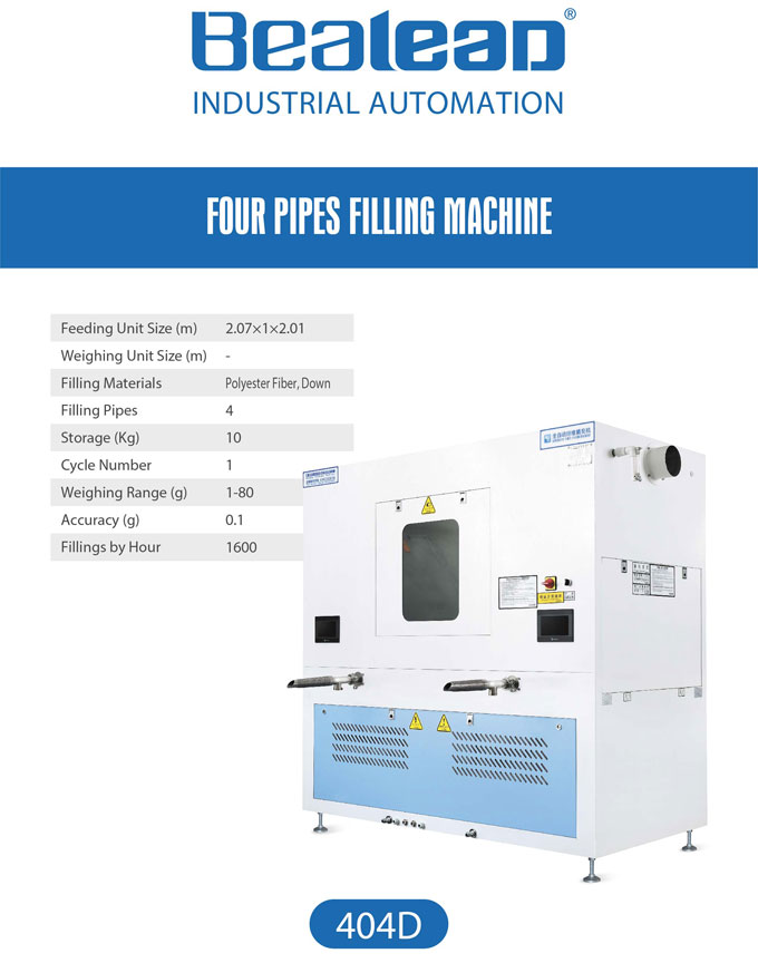 404D全自動稱重棉絨一體機,一臺機器同時滿足可充棉,珍珠棉,羽絨三種應用需求。