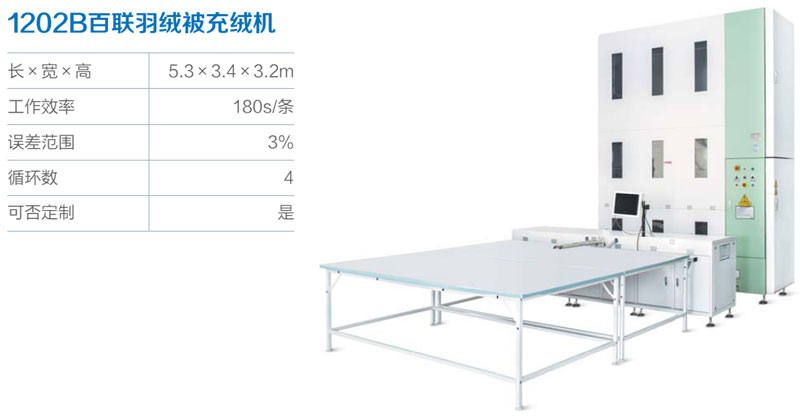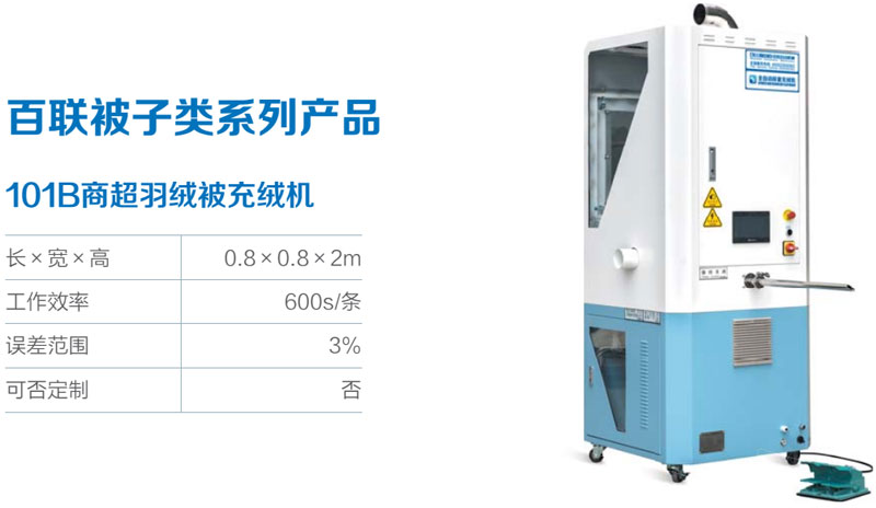 除了上述解決方案之外,百聯(lián)還自主研發(fā)了滿足DIY羽絨被需求的101B型自動(dòng)充絨機(jī),適用于商店或超市等場所,通常只需10分鐘,就能經(jīng)過上絨、充絨等自動(dòng)操作完成1條羽絨被的制作。