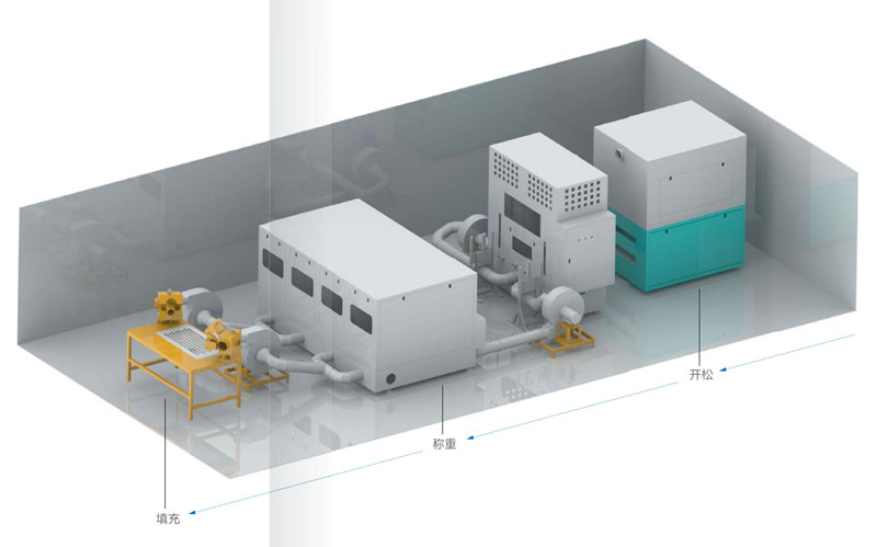 再看,針對(duì)枕芯的自動(dòng)化解決方案(如下圖所示)。 它主要由開松、稱重、填充三個(gè)流水線環(huán)節(jié)組成,主要涉及產(chǎn)品有:百聯(lián)自主研發(fā)的自動(dòng)開松機(jī)以及枕芯填充專用設(shè)備。