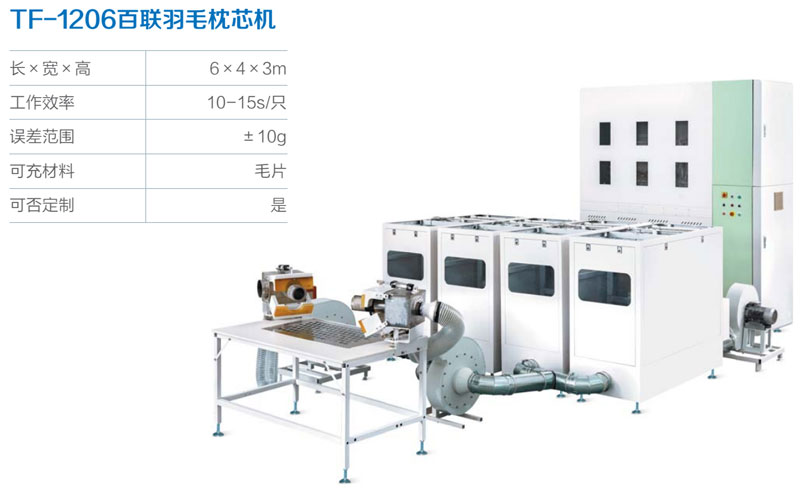 1206型羽絨枕芯機(jī),設(shè)計(jì)了2個(gè)充絨口,采用2稱重循環(huán)稱重,充絨精度為0.1g,可填充羽絨毛片,能在10~15秒之內(nèi)完成1只枕芯的填充。