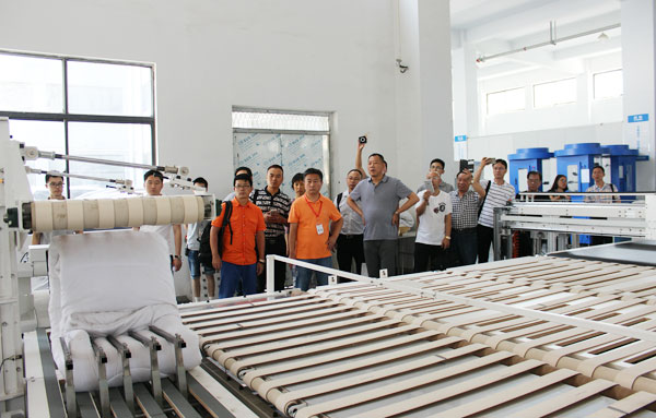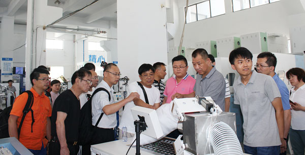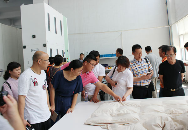 隨后,專家和企業代表們走進百聯生產車間,重點觀看了1202B羽絨被充絨機、全自動折疊機、全自動棉枕芯機以及101型商超羽絨被充絨機等產品的實物操作過程,對產品功能、性能有了直觀的了解,對家紡自動化整體解決方案給予了高度的評價,并結合家紡生產中的具體問題進行了咨詢,也提出了需求和建議。