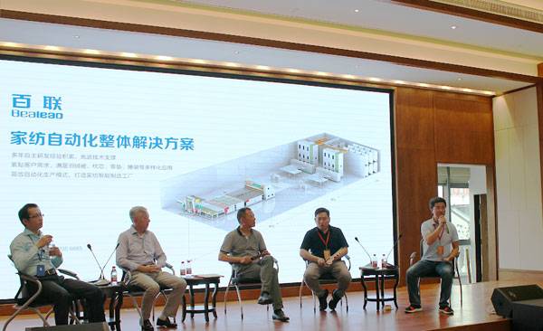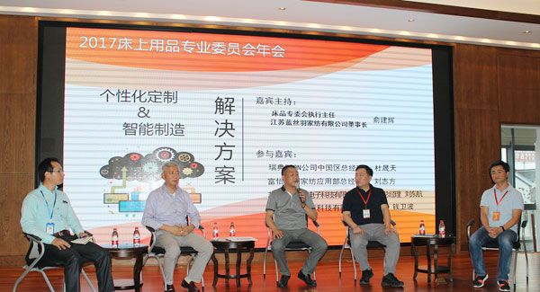 就在床品行業專家和企業代表訪問百聯總部的前一天, “2017床上用品專業委員會年會”在吳江召開。來自床品行業及關聯行業的200多位代表齊聚一堂,共同探討和總結了床品行業的現狀,從做強產品、技術革新、渠道升級等方面共商未來發展之路。公司董事長錢衛波作為年會主題論壇的嘉賓,與在場的與會代表共同探討了“個性化定制及智能制造解決方案”在家紡生產升級中的作用,對百聯家紡自動化整體解決方案做了分享、解讀,臺下與會者反應熱烈、積極互動,取得良好效果。