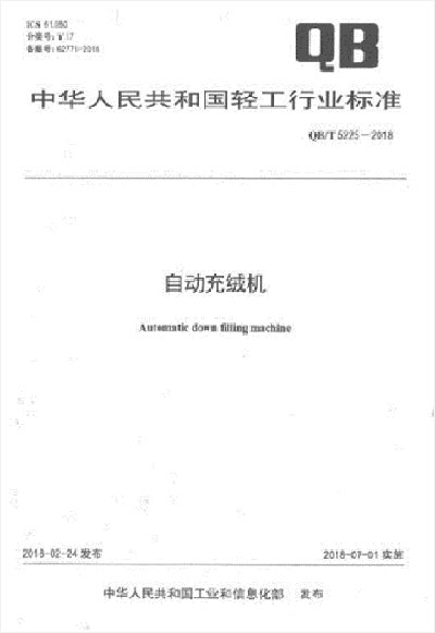 自2018年7月1日起,由百聯牽頭主起草的編號為QB/T5225-2018 號的“自動充絨機”行業推薦性標準正式實施了。該標準規定了自動充絨機的術語和定義、產品分類、要求、試驗方法、檢驗規則、標志、包裝、運輸和貯存,適用于自動充絨機,其他充填物的類似設備可參照執行。