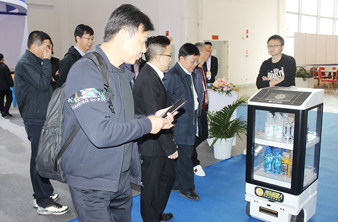 在聯領智能的展位上,參觀者好奇地圍聚在一個內裝食品的小柜子前。小柜子能自動避開障礙物,自由穿梭在來往的參觀者之間,為其提供自助購物服務。