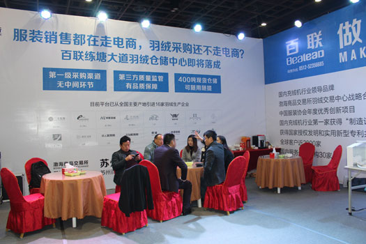 展會現場客戶絡繹不絕,很多都是常熟本地已使用我們百聯充絨機的老客戶,看到我們百聯練塘大道羽絨倉儲中心即將落成的消息非常感興趣,我們擁有16家羽絨生產企業直接供貨,直接采購,無中間環節;第三方質量監管,羽絨有品質保障;400噸現貨倉儲,可隨用隨提。為常熟的用絨企業減少采購成本,現場客戶了解后就簽約提貨!